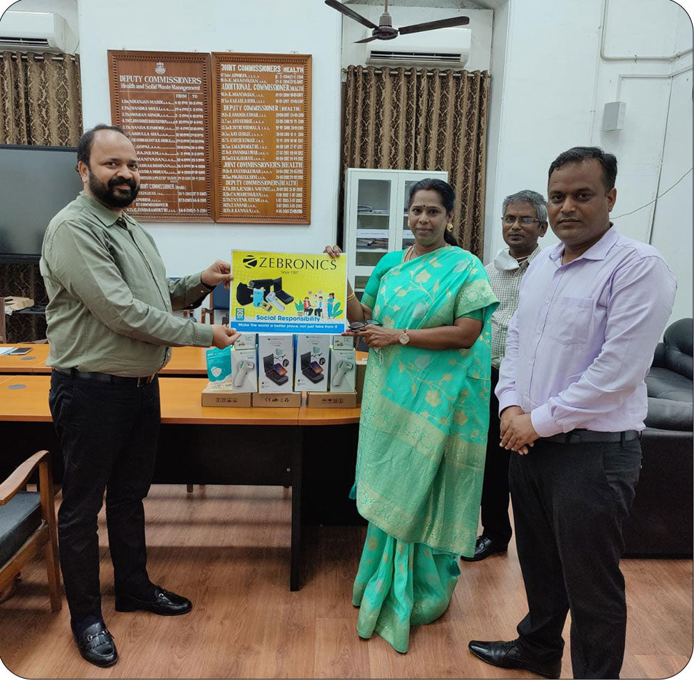 Zebronics donated 10,000 Nos of Pulse Oximeters, 2 lakh Face Masks, 3500 Infrared Thermometer, 365 UV Sanitizer boxes, 365 Fogging Spray Guns to the Greater Chennai Corporation which was received by Dr. G. Shanthakumari - Chairperson Standing Committee (Public Health ), Shri . Shankar Lal Kumawat, I.A.S. - Joint Commissioner (Health) and Dr. M. Jagadeesan - City Health Officer, Public Health Department, on 20/07/2022 as a part of CSR initiative.