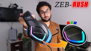 ZEB-Rush is a premium gaming headphone from Zebronics with ergonomic design, padded headband, 40mm Neodymium drivers, adjustable mic, RGB LED lights, a Dual 3.5mm connector along with USB and dual to single pin converter.